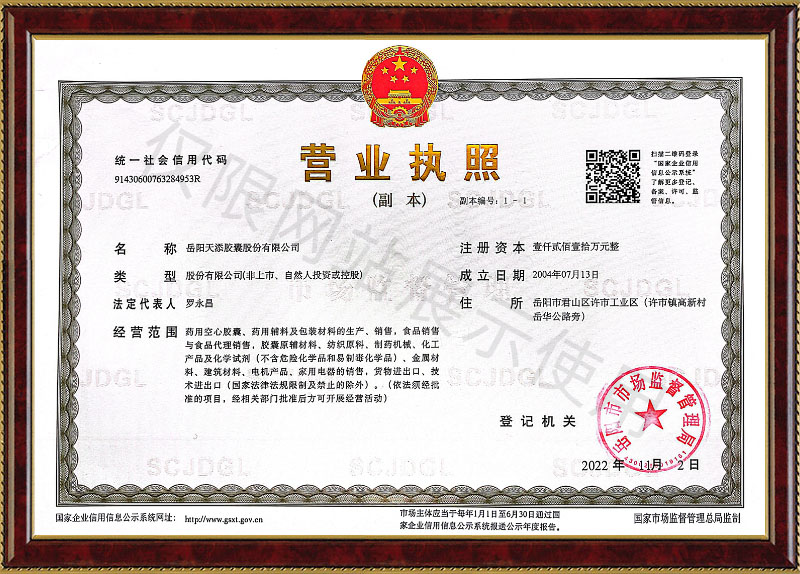 岳陽天添膠囊股份有限公司(股權代碼:600581HN,以下簡稱“公司”)是一家專業生產藥用空心膠囊的現代化高新技術企業,湖南省明膠空心膠囊生產企業。她座落在具有傳奇般色彩的、美麗的岳陽市君山旅游風景區,與舉世矚目的岳陽樓遙遙相望,水陸空交通便利。